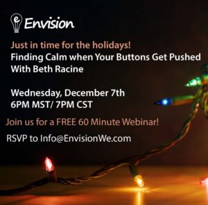 BLOG: JUST IN TIME FOR THE HOLIDAYS! Just In Time For the Holidays THURSDAY, DECEMBER 1ST, 2016 Finding Calm when Your Buttons Get Pushed With Beth Racine Have you felt stressed lately? With the fullness from Thanksgiving dinner and time with family, finals weeks underway for college and graduate students,